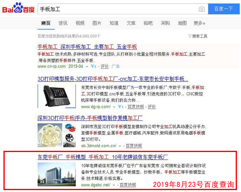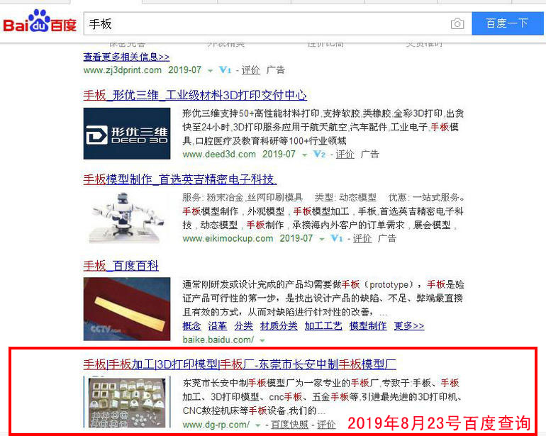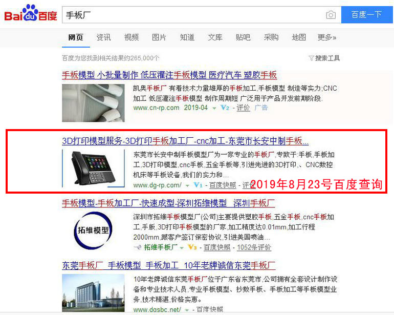 手板加工 : 2019-02-28上線(xiàn) 2019-03-05百度第20(原為第5頁(yè) 第7位) 2019-03-13百度第10名 2019-03-19百度第3名 2019-03-25百度第1名