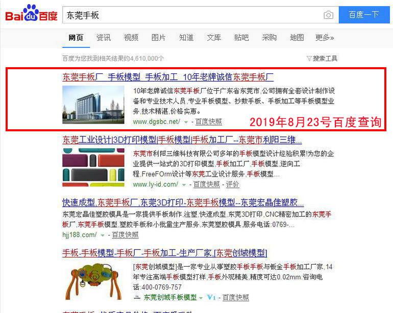 東莞手板廠(chǎng) : 2019-02-28上線(xiàn) 2019-03-05百度第18名 2019-03-19百度第8名 2019-03-25百度第2名(排名第1名的網(wǎng)站www.dgsbc.net也是我公司管理優(yōu)化的網(wǎng)站)