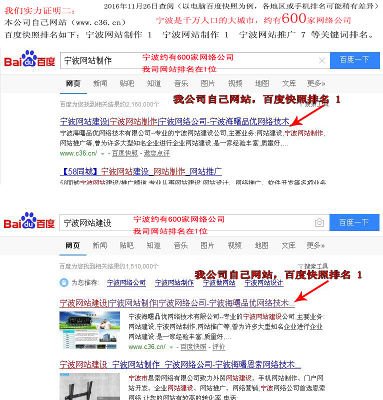 2、浙江省寧波市是千萬人口的大城市,約有600家網(wǎng)絡(luò)公司,競爭異常厲害,“寧波網(wǎng)站建設(shè)”“寧波網(wǎng)站制作”這二個(gè)關(guān)鍵詞,本公司網(wǎng)站多年來基本上百度快照排在 1名(360搜索也排名在1名)